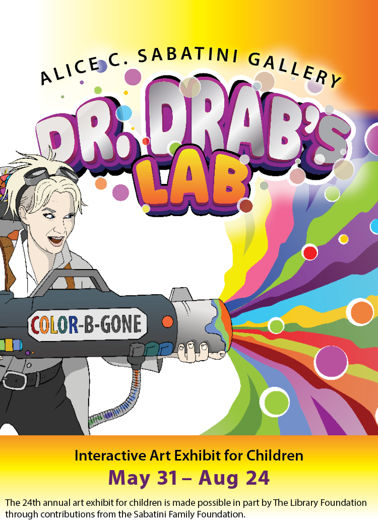 Help us rescue the paint colors from Dr. Drab's Lab May 31 - Aug 24, 2025, during this interactive art exhibit for children in the library's Alice C. Sabatini Gallery. Dr. Drab, a scientist turned artist, has stolen all the paint colors in the gallery! Each week we will work together to get all the paint colors back.